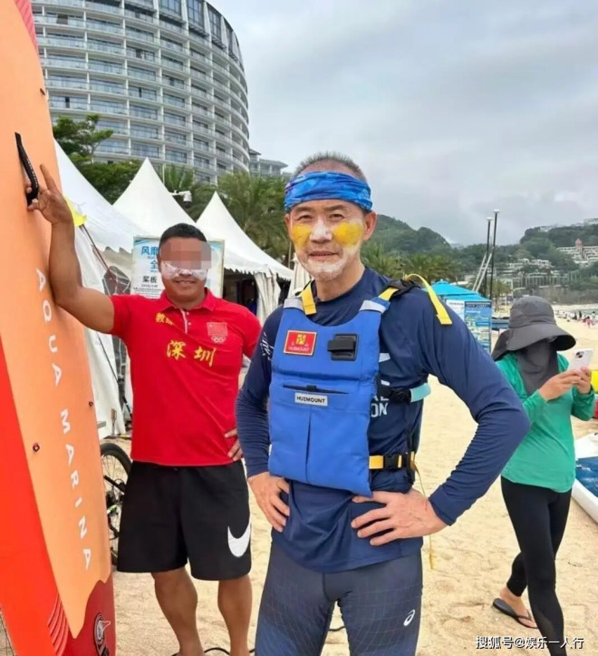 他分享了几张照片。一张是大合照,王石站在中间,穿着休闲外套和运动短裤,头发和胡须已经花白,皮肤能看出年龄带来的松弛,但腰板挺得很直,身材精瘦,肌肉线条清晰。另一张照片里,王石裹着蓝色头巾,脸上涂着白色和黄色的颜料,穿着蓝色长袖泳衣和短裤,外面套着救生衣,双手插在腰间。