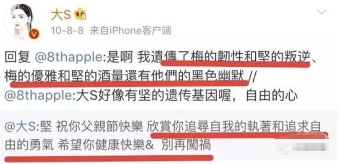 她与S爸的关系似乎也是错位的,父亲节她给S爸的发的祝福是:坚,健康快乐&别再闯祸。