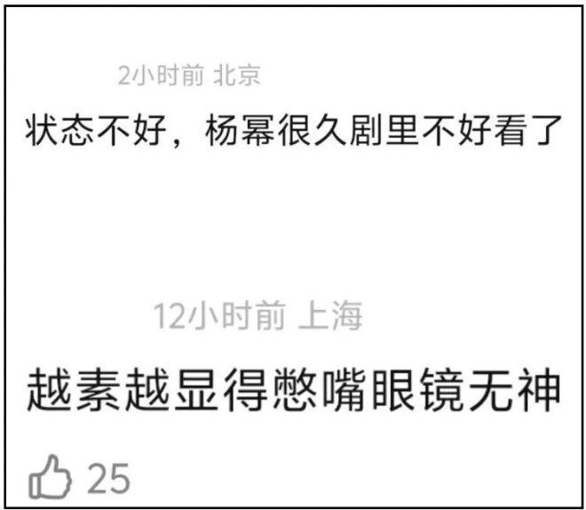 不知道从什么时候开始,杨幂很容易显出疲惫,与其他85花的双目无神不同,杨幂更像是气血不足,正如网友所说,明明本人是大明星,出演的角色亦是大女主,杨幂却是暮气沉沉的。
