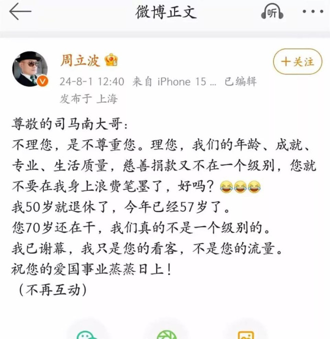 到了2024年,国内网友发现他的社交媒体账号又被禁言了。原因是他发表了一番“军舰重要,但饺子比军舰更重要”的争议言论,并因此和网络名人司马南爆发了一场激烈的骂战。 这距离他上一次因为不当言论被封号,才过去没多久。 看来,即便远离了舞台,他这张惹祸的嘴,还是没能管住。