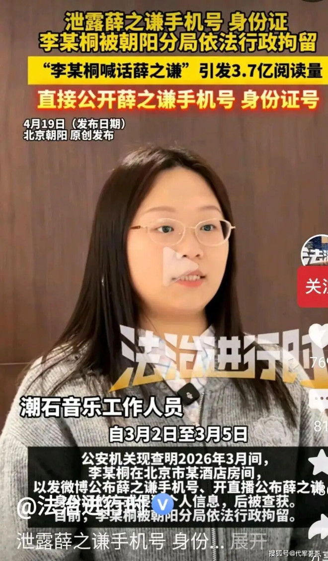 2026年4月19日,#李雨桐被行拘# 话题强势登顶热搜,北京广播电视台《法治进行时》栏目独家证实,李雨桐因非法泄露薛之谦个人隐私,被北京市公安局朝阳分局依法行政拘留,执行期为4月10日至4月20日,目前仍处于拘押状态。