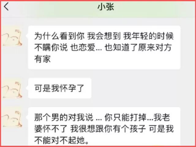 据聊天内容显示,张婉婷亲口对Q女士说,自己年轻那会儿也爱过一个已婚男人,而且在明明知道对方有老婆、有家庭的情况下,还怀了那个男人的孩子。