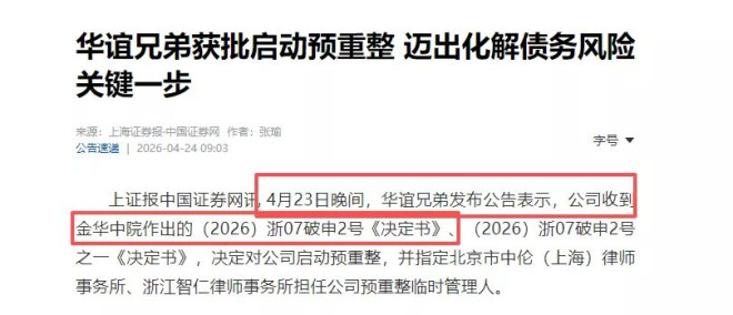 4月23日晚,华谊兄弟发布公告,称已收到金华中院作出的“破申”2号《决定书》,将对公司启动预重整。