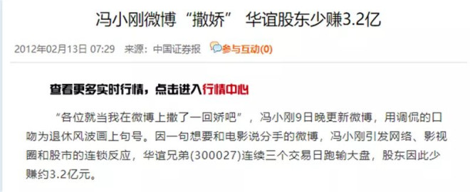 2012年时,他在微博“撒娇”抱怨太累了想退休,导致华谊兄弟股价连着3日下跌,让股东们损失至少3.2亿。