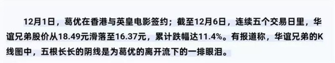 而头一年葛优离开时,华谊兄弟的股价也是接连下滑,从19.49元跌至16.37元。直到公司方站出来称葛优从来不是旗下艺人,股价才开始回升。