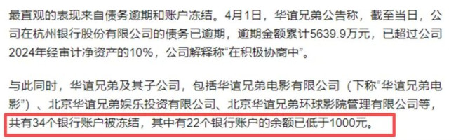 到今年4月份,华谊兄弟处于20项诉讼中,逾期债务5640万,名下34个账户被冻结,其中22个的余额都低于1000元。
