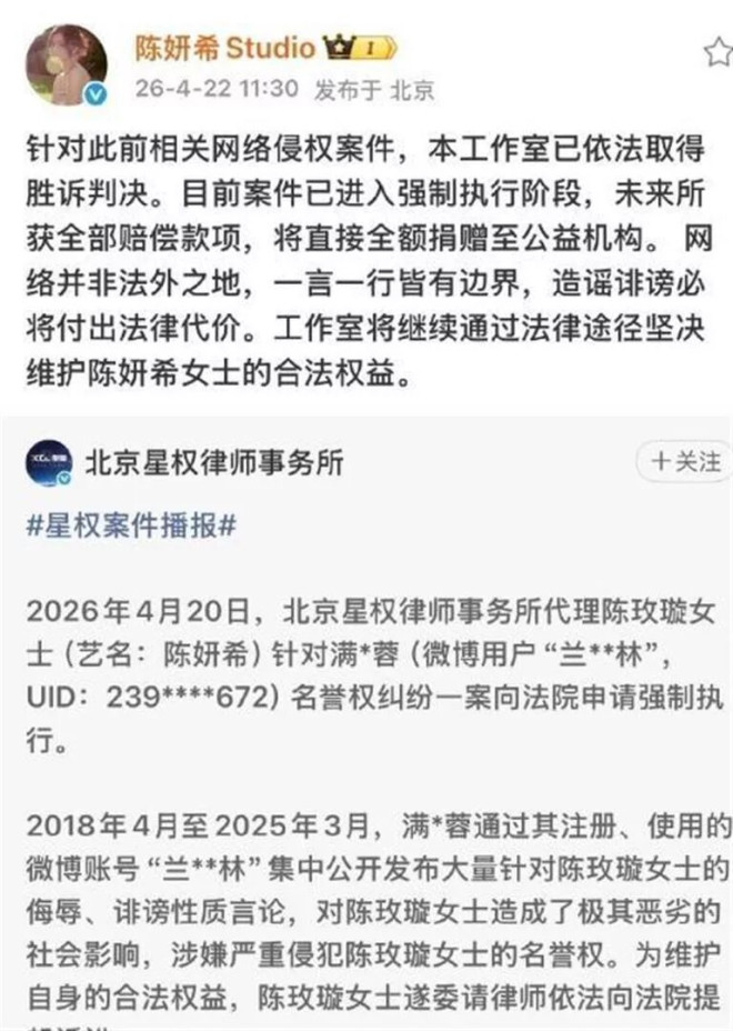 2026年4月20日,陈妍希方面向法院递交了强制执行申请。 两天后,4月22日,律师事务所公开了案件播报,陈妍希工作室也发文确认案件进入强制执行阶段。 工作室同时宣布,未来执行到位的全部4万元赔偿款项,将直接全额捐赠给公益机构。