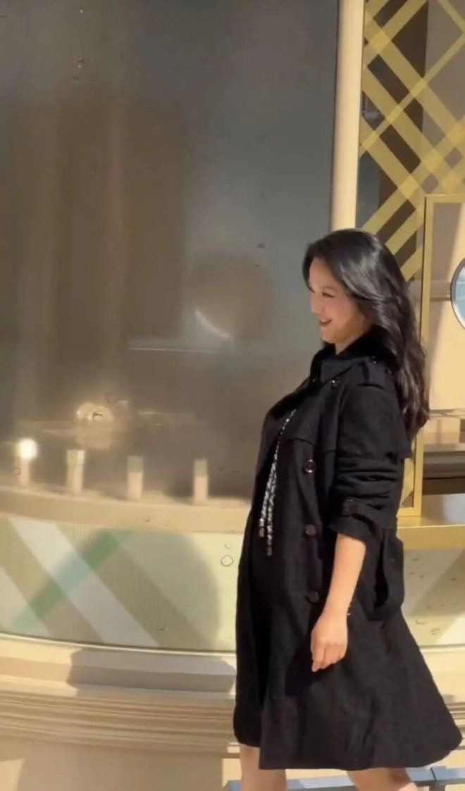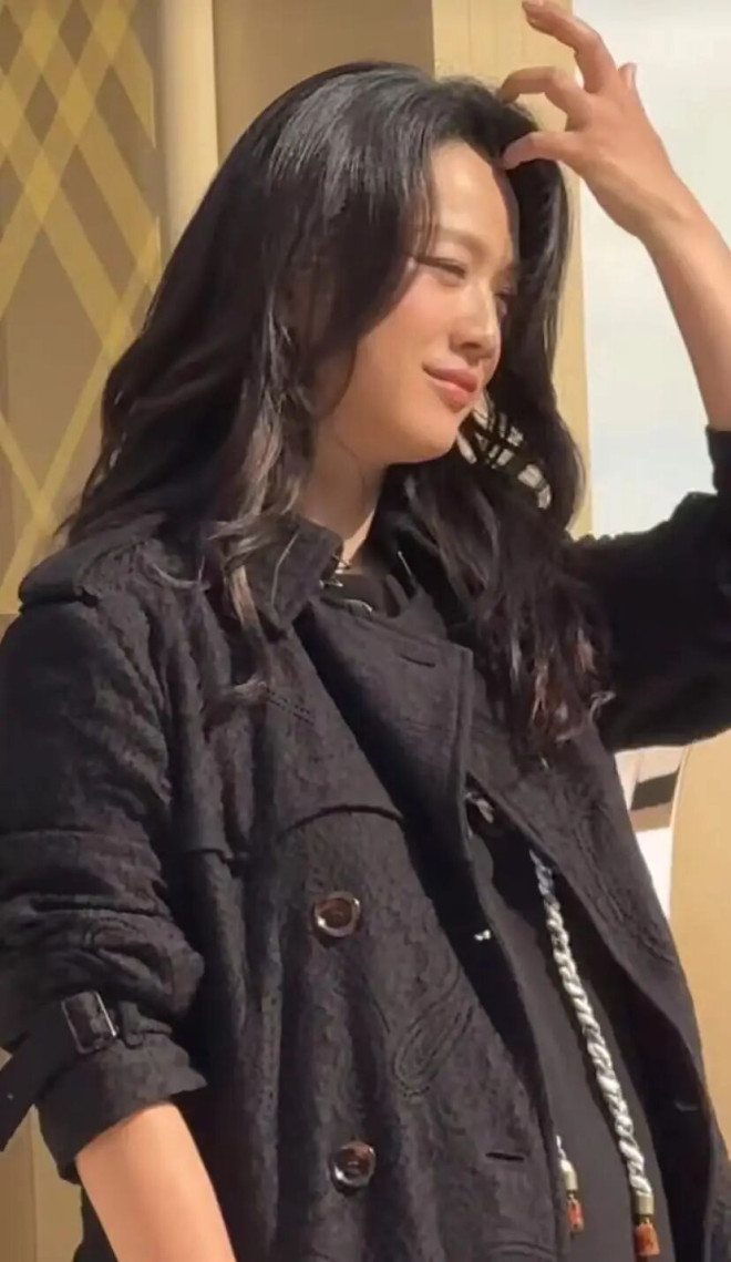 她身穿黑色长款宽松风衣,巧妙遮挡了身材曲线。