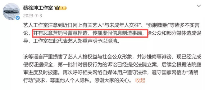 虽然蔡徐坤迅速报警并澄清从未涉及未成年,并以“诽谤”为由起诉相关账号,指控其捏造“未成年堕胎”“私生活混乱”等不实信息,导致其社会形象严重受损。