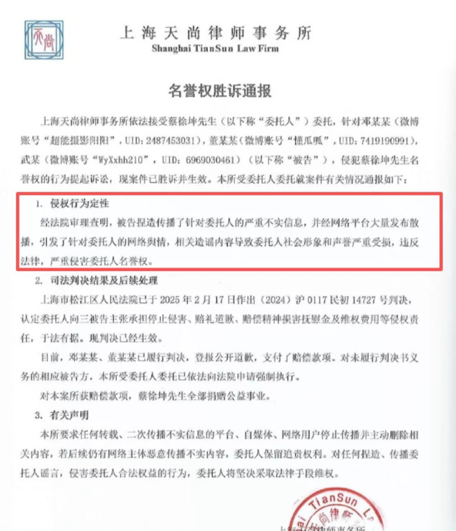 直到2025年2月,上海市松江区法院终审判决蔡徐坤胜诉,认定被告爆料中确实存在捏造虚假信息,对蔡徐坤构成了名誉侵害,并且抨击了网友们的网络暴力行为。