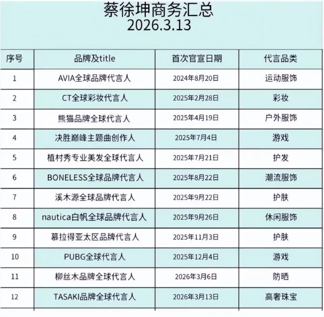 2024年8月,蔡徐坤官宣了AVIA全球品牌代言人;2025年,蔡徐坤官宣了9个商务代言,其中8个是全球代言,涵盖服饰、彩妆、护肤等多个品类;2026年,蔡徐坤拿下了高奢珠宝TASAKI的全球代言;4月19日,他的新代言Saucony索康尼开启预热。
