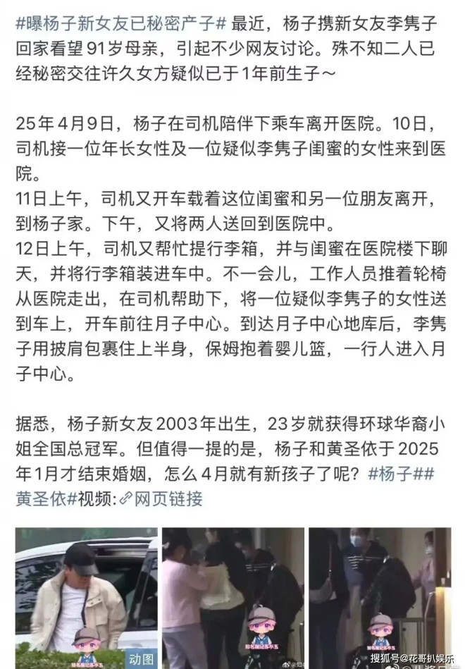 2025年4月12日,杨子身边的司机曾亲自驾车,将李隽子从医院接出,随后径直送往高端月子中心。
